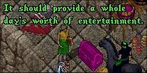 She decided to make a similar event.. The plan being to create a chest so heavy that no one could move even a single step with it and no one could bank it. It would be made colorful and obvious as to attract attention and dropped at someplace very public like west brit bank. By wrapping it in locked and trapped chests, it would be impossible to loot it while surrounded by other would-be looters, so it would be quite a contest to see who could get it to safety and loot it. :> Of course, it is only fun if no one knows it is an event. :>